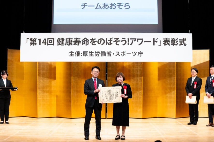 The 14th “Extend Your Healthy Life Expectancy! Award” was held aiming to promote and disseminate awareness-raising initiatives for the prevention of lifestyle-related diseases, jointly organized by the Ministry of Health, Labour and Welfare (MHLW) and the Japan Sports Agency. “Team Aozora” in Yugawara Town was honored with the Excellence Award of the Director-General of the Health and Welfare Bureau for the Elderly, MHLW, in the field of long-term care prevention and support for older adults’ daily living.